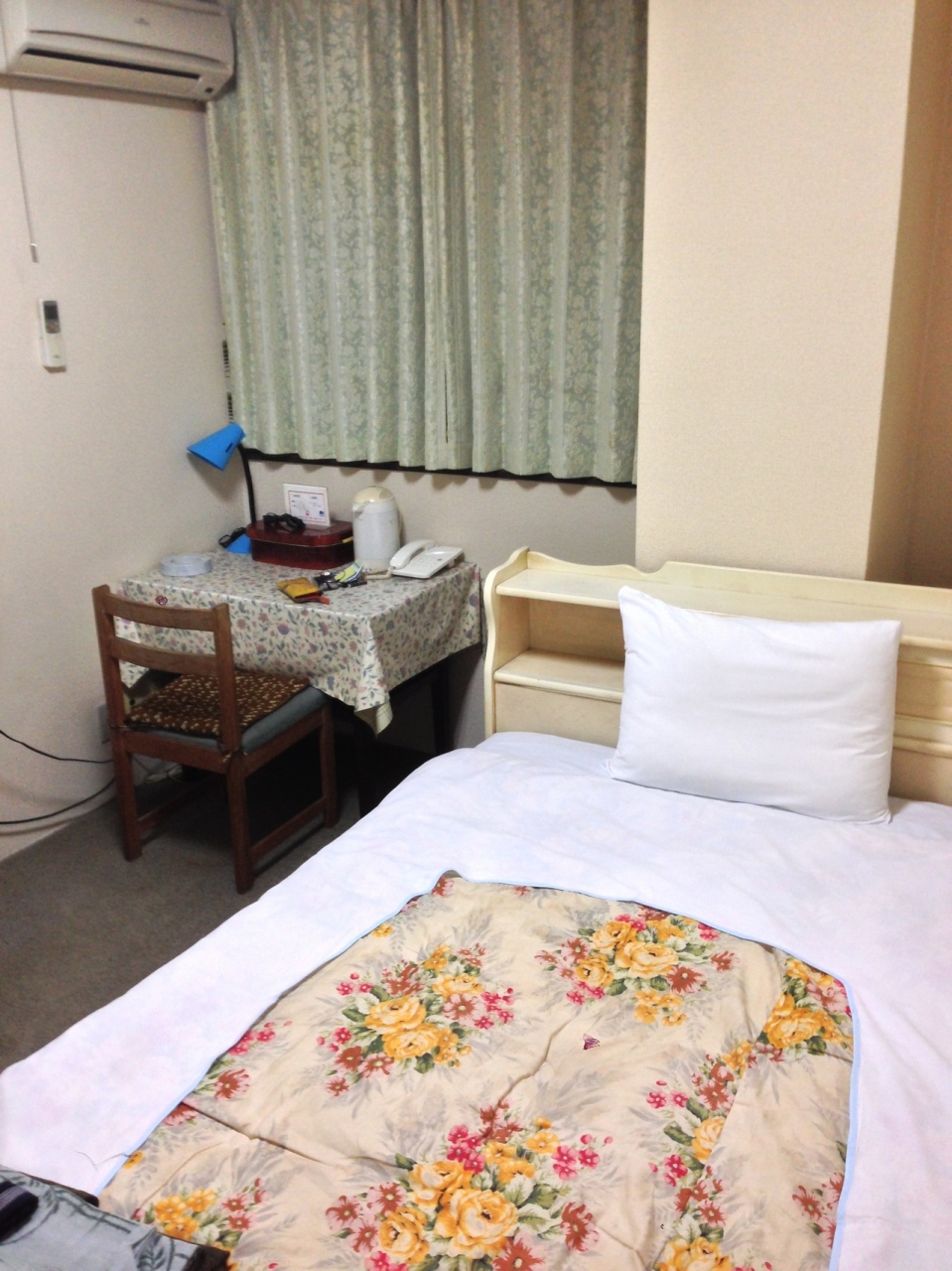 今回はシングル利用。6畳ほどの部屋にダブルベッドがあり、テレビ、エアコン(冷暖房)、テーブル、湯沸かしポット、茶器、電気スタンドが備え付けられています。アメニティはバスタオル、タオル、歯ブラシと紙コップがあります。冷蔵庫、ドライヤーはありませんでした。