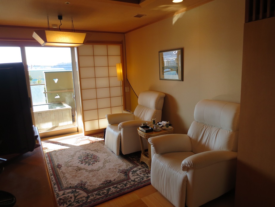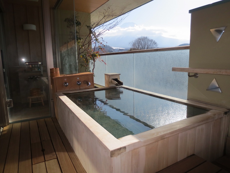 (ミニバーと自由に使える物2つ)お茶やネスプレッソなどがありました。電動のリクライニングチェアが2つあり、センスの良い内装です。洗面所の隣に洗い部屋、ベランダに檜の24時間はいれる温泉があります。大人2人がゆったり入れる大きさで富士山が見えます。部屋からもそのまま入れます。お湯質は余り特徴が無く、高アルカリだそうですが無味無臭です。