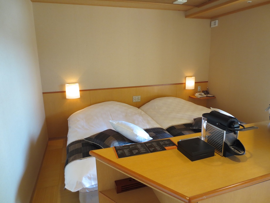 部屋はクイーンサイズのベットが2つ、部屋の中央にはサイドボート、中に冷蔵庫