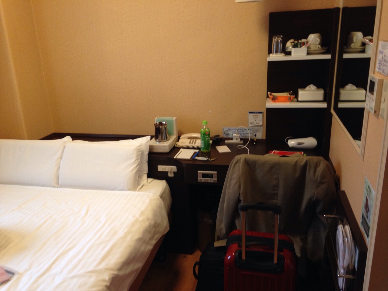 3月末はお花見シーズンで海外からのお客さんが多いそうです。このホテルにも外国人客がいっぱいでした。1Fのロビースペースで夜になるとラーメンの無料サービスがありました。私たちは出遅れましたが、みなさん自分で茹でて食べていたようです。ラーメンの他にも赤ワイン、白ワイン、生ビールのサーバーが置いてあってこちらも無料で頂けます。珈琲やお茶も無料サービスでした。これはお得なサービス満点のホテルでした。