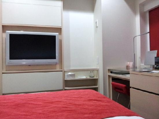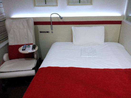 シングルルームの部屋はベットで占拠されていますが、バスルームとの仕切りがガラス張りのため狭さを感じません。ただ、床に大きめのスーツケースを広げるスペースはありません。バスルームはきれいで十分な広さで、バスタブはありません。シャワールームとトイレが独立していて良いです。エアコン、空気清浄機、大型TV、冷蔵庫、無料の有線LANがあります。冷蔵庫にはサービスで500mlボトル飲料水が1本があります。