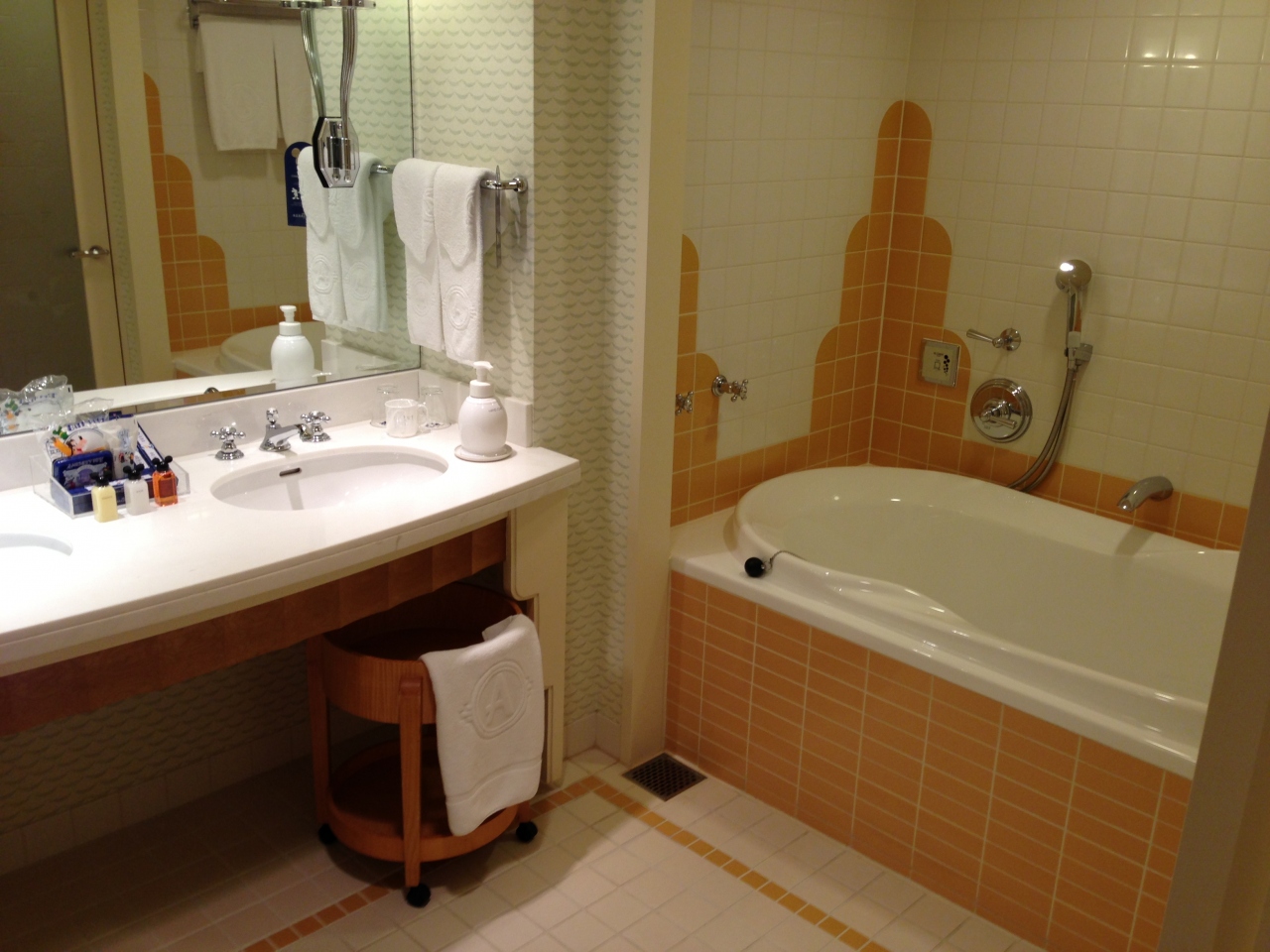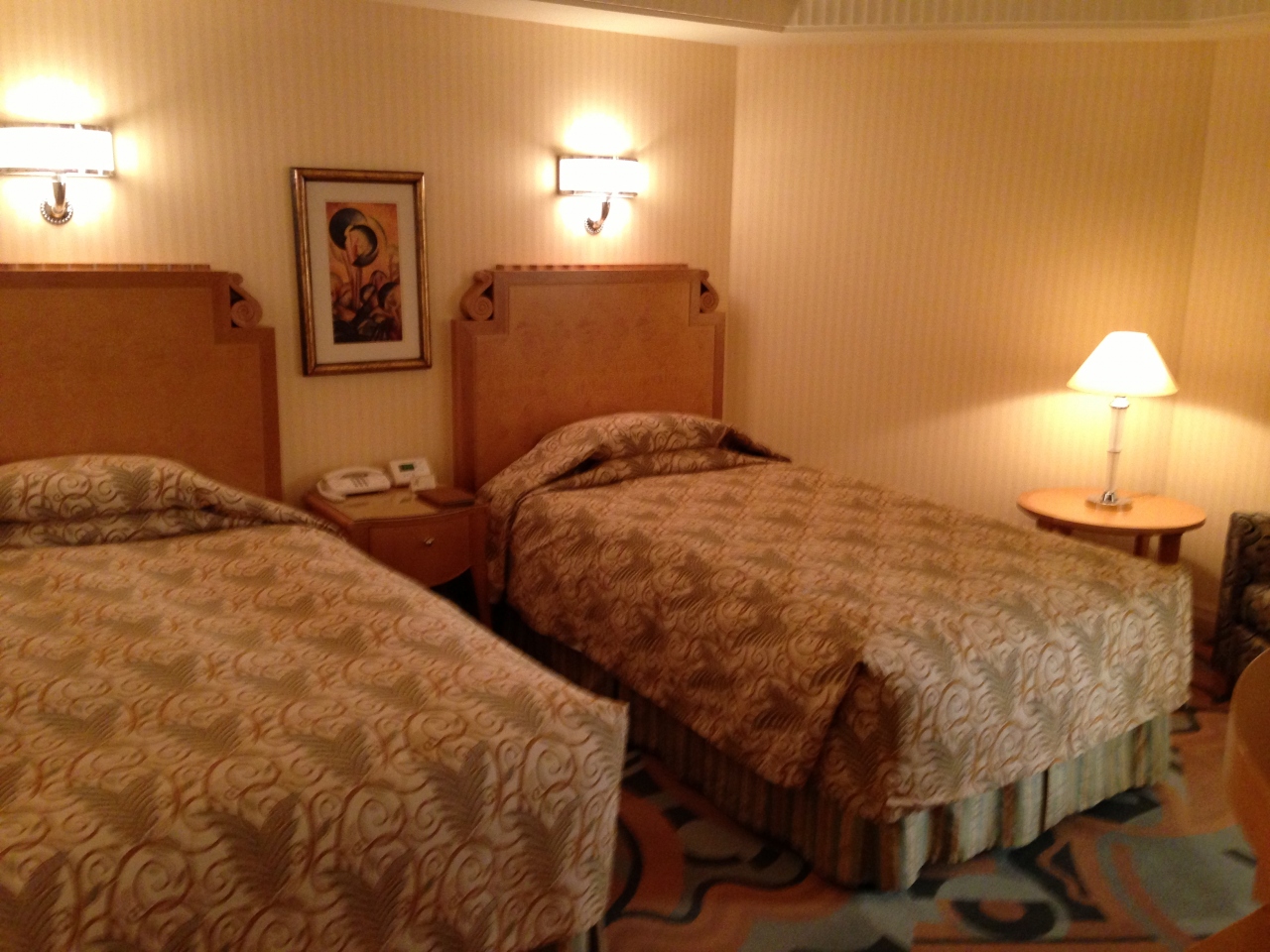 スーペリアルームを予約していたのですが、チェックインの際に空きがあるとの事で追加代金を払ってパームガーデンビュールームにアップグレードしました。このホテルに泊まるのは2回目で前回に宿泊したスーペリアルームと比べて部屋が格段に広かったです。リビングとベッドルーム、バスルームにテレビがあり、トイレも2つあります。クローゼットも広くて荷物もすっきり収納できます。バスルームはシャワーブースが別にあり、ゆったりとお風呂に入ることができました。係の方の対応も気持ちが良く、さすがディズニーって感じです。夜にパークから帰った後の夜食と朝食のルームサービスを頼みましたが、部屋が広いのでゆったりとしたスペースで食べることができました。快適に過ごす事ができたので、また泊まりたいホテルです。