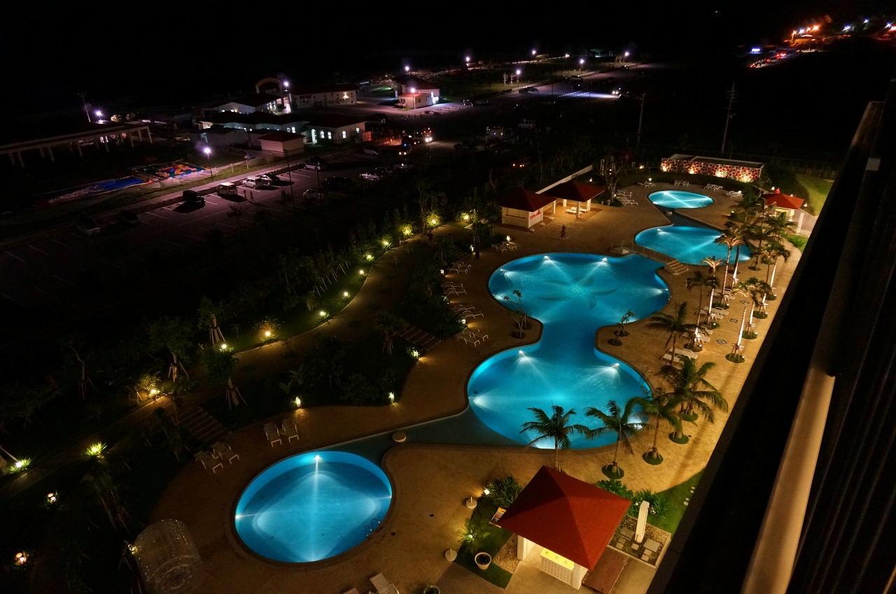 客室はオーシャンビュー、ベランダから眼下を見下ろすとプール、ガーデンバーベキュー、ウェディングホール、右手に美々ビーチいとまんが見えます。左側にはヨットハーバーが見えます。空を見上げると(その日の風向きによりますが)飛行機が次々と飛んで行きます。快晴の日は空も海もオキナワンブルーでステキです。夕方はサンセット、夜はプール周辺の明かりがリゾートらしい美しさを演出しています。
