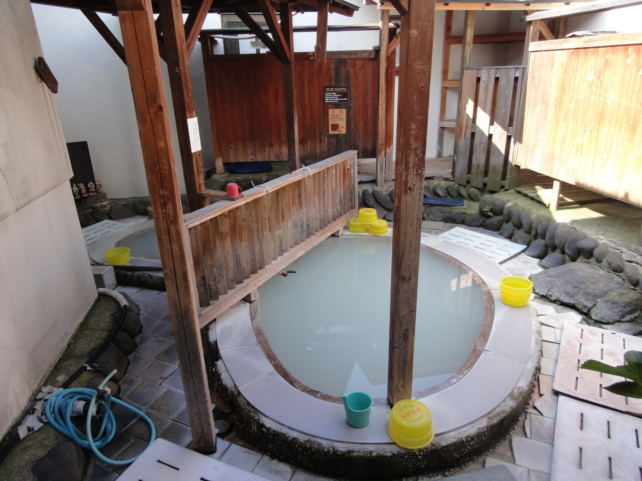 宿のお風呂は白濁の湯に満たされた内湯と露天があり、宿の裏がまさに源泉です。