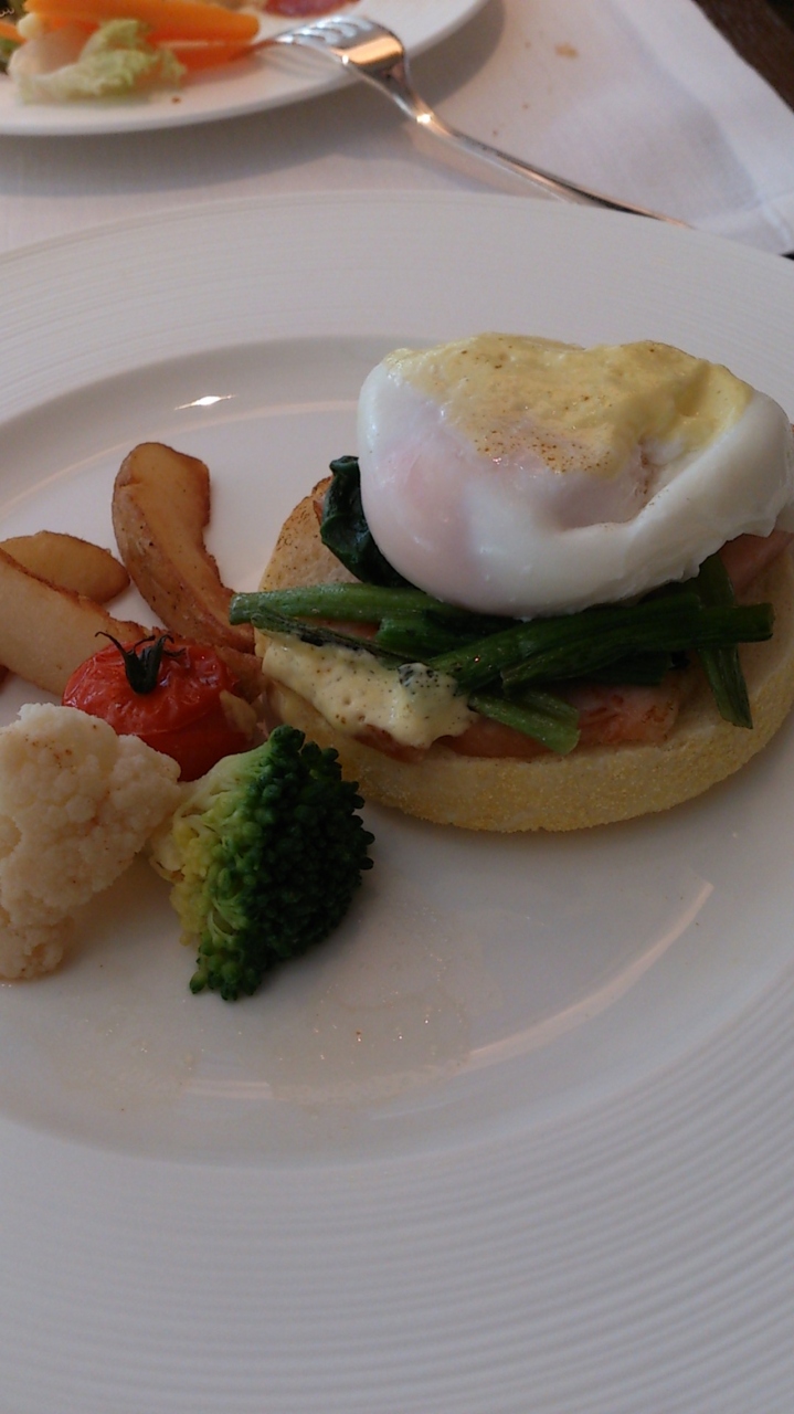 朝食は和定食か洋食ビュッフェを選べました。洋食ビュッフェでは卵料理だけは作って持ってきてくれるので、エッグベネディクト、オムレツなどから今話題のエッグベネディクトを選びました。