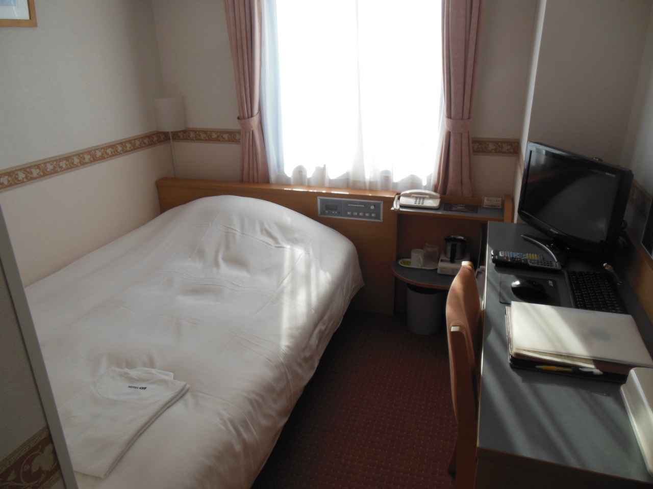 郡山駅まで約1.6kmほどありますので、歩くと25分ぐらいでしょうか。そのかわり駐車場が無料なので車利用者にはお得です。ホテルのすぐ前にバス停があり、日中であれば5~10分ぐらいおきの運行です。部屋は標準的ですが、パソコンがついていました。ホテル内で焼いているという朝食のパンも美味しかったです。