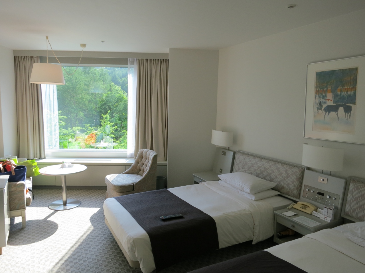 部屋は山側であったが、ツインで十分な広さで、ソファーベッドも快適でした。食事は朝バイキングは洋食和食、定番のおかずが中心でしたが、ビン入りのヨーグルトや牛乳があるのは何だか嬉しいです。観光地からの距離も近いのに、静かでゆっくりできるとてもいいホテルだと思います。