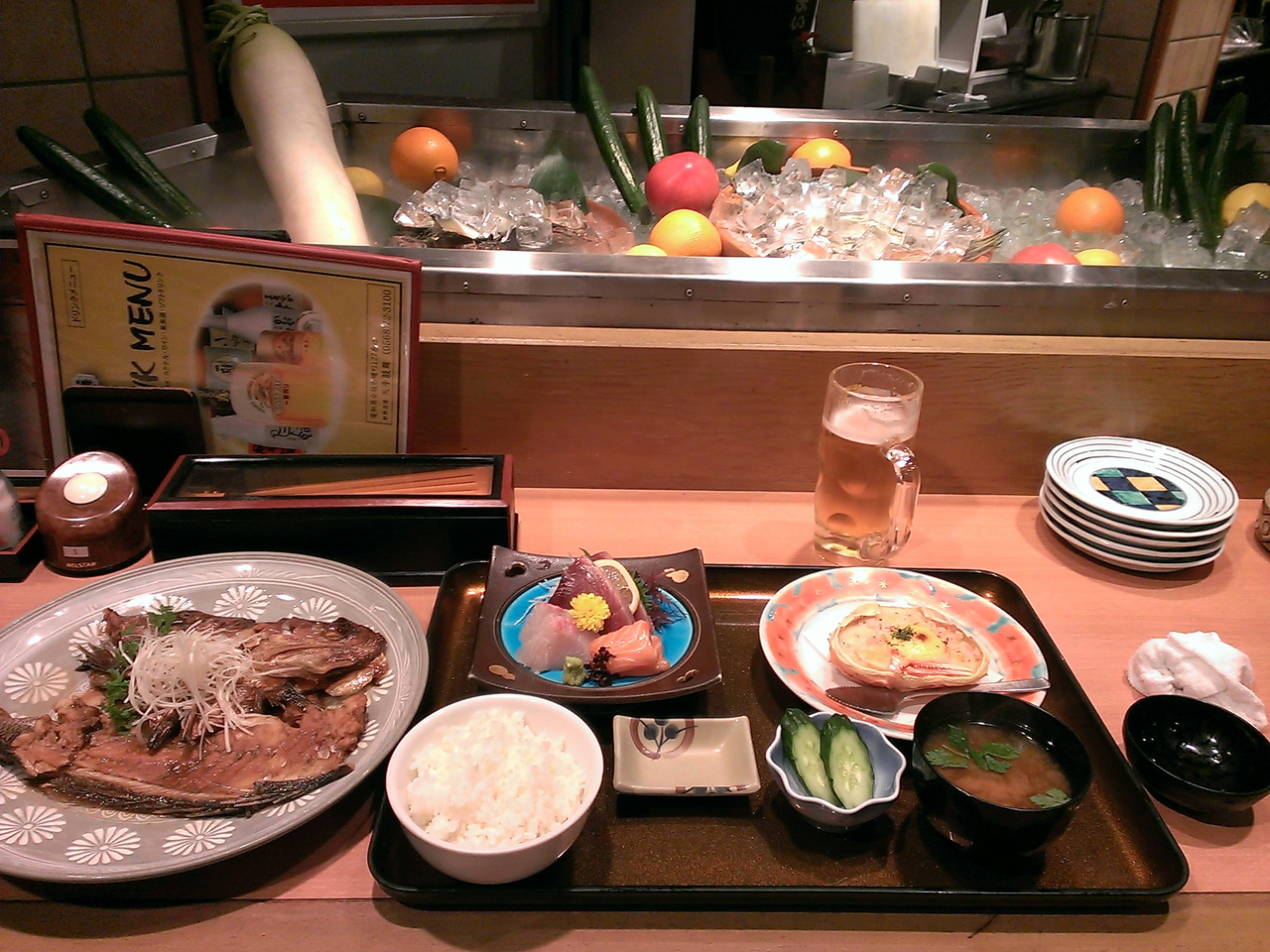 楽しみの居酒屋での夕食は、刺身、カニグラ、鯛のあら煮などがでて、更にワンドリンク付き!追加で焼き鳥と焼酎を飲んで大満足。ダブルベッドでぐっすり。いいホテルです。