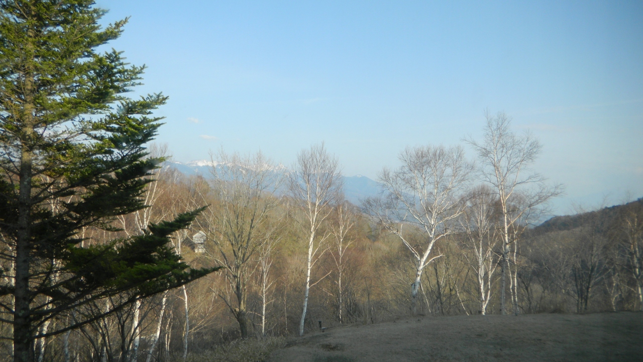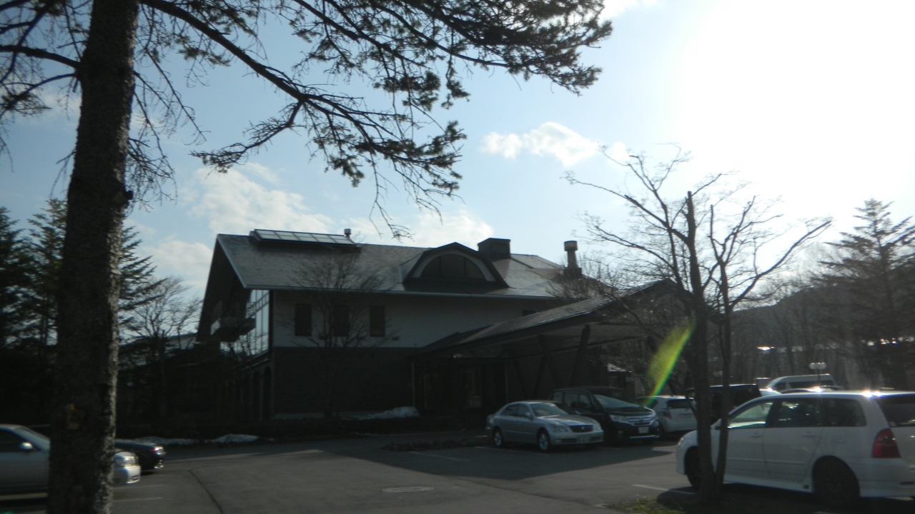 2階の部屋の窓から白樺と左に雪が残る八ヶ岳が見えました。朝、3階のレストランから左に八ヶ岳、右に南アルプス、その間に富士山と美しい景色が見えました。気持ちが洗われます。ホテルの周りに遊歩道が設置されていますが、まだ冬季のうちで利用できませんでした。
