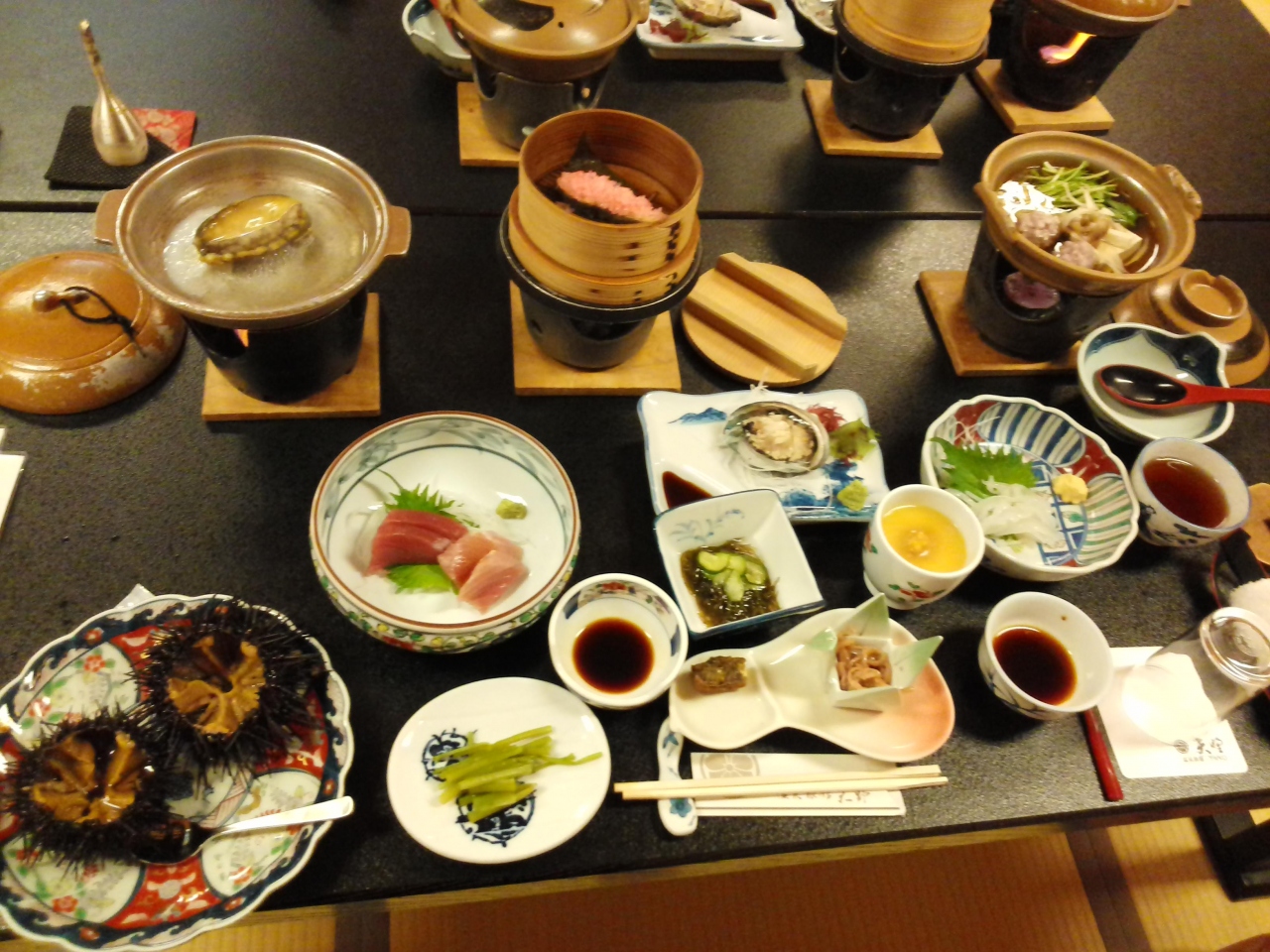 お食事処は、畳の上に椅子が用意されており、楽に食事できました(夕食)。団体客は団体用にお部屋になっていたため、個人客と同じにならないようにされており、個人客も同じ所だけど、つい立てで隣の方と同じにならないよう、家族ごとで楽しめるようになっていました。食事の前に若女将から説明があり、お品書きもリクエストすれば後でいただけました。食事は、おしゃれで女性でも全て食べられるほどほどの量でした。あわびの酒蒸し焼きもおいしく、とてもやわらかく苦い部分もおいしく食べれました。