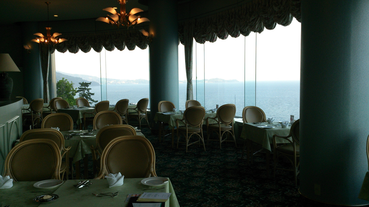 広い窓の外に広がる海は絶景なので、ディナーの時間は暗くなる前の第一部にするといいかもしれない。