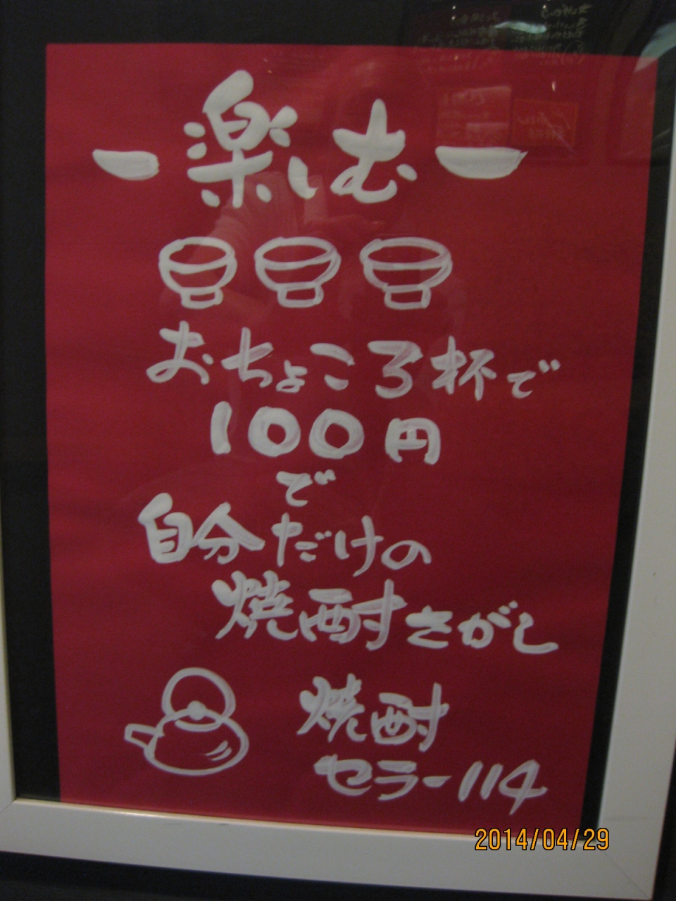 地下1階にある焼酎セラーでは、銘柄は限定されますが、焼酎おちょこ3杯100円で楽しめます。また、ここで気に入った焼酎を買うこともできます。でも買うとなるとお値段は高めなので、他の買った方がいいと思います。