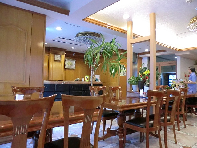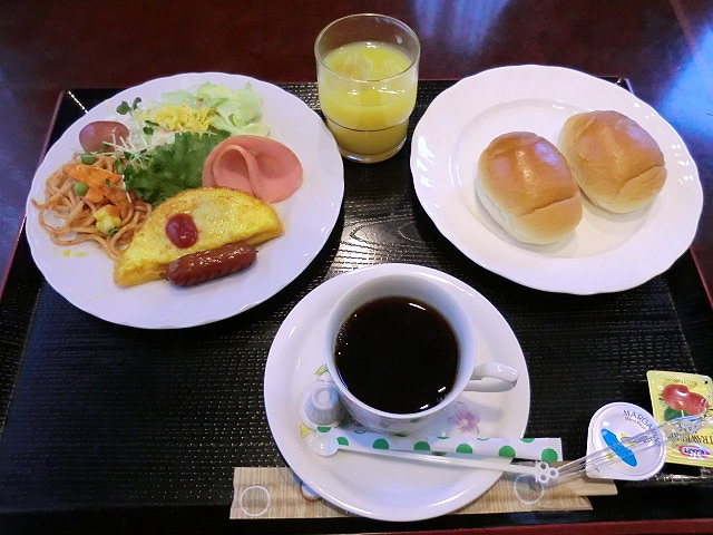 朝食は1Fロビー前のテーブル席でモーニングプレートを頂きました。まぁ普通かな。