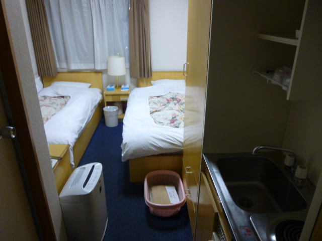 4,5人が洗い場で洗える大浴場があります。その風呂は広く,4,5にんは入れます。部屋には机・椅子があり,ユニットバスもあります。なんと,電気コンロまで付いていました。部屋にはLANも使えました。長期滞在によいかもしれませんね。