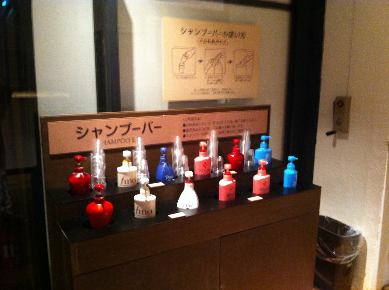 お風呂は男女入れ替え制で、夜と朝に別々のお風呂を楽しめます。シャンプーバーなるものがあって、好みのシャンプーを使えるのがGood。18時までの時間限定ですが湯上り処にビールとトコロテンのサービスがありました。