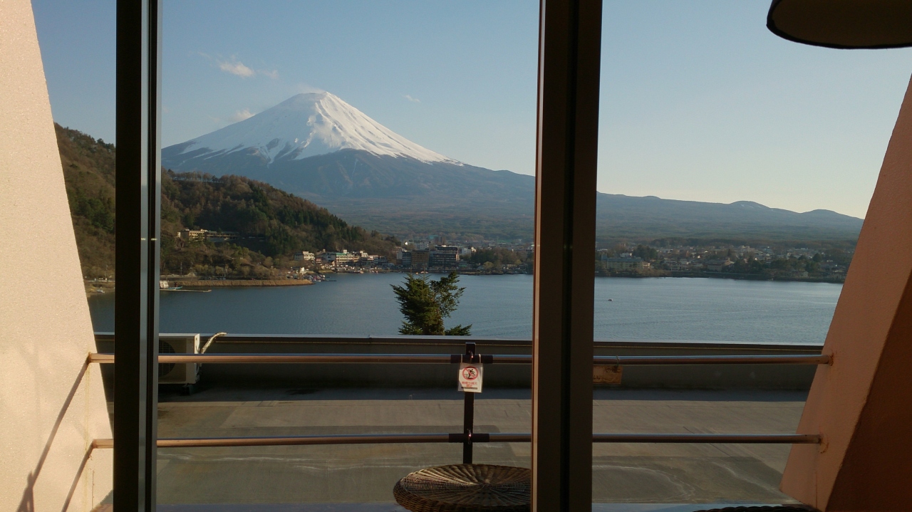 一覧を見る正面に河口湖。そして、その向こうに雲を携えた富士山の見えるホテル