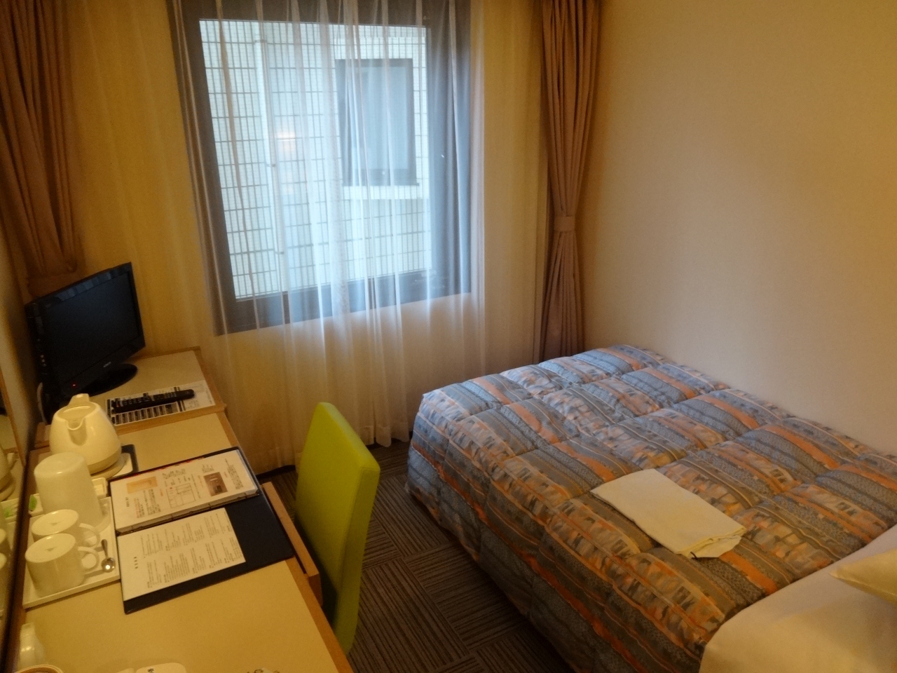 客室内はコンパクトにまとまっています。窓のカーテンを開けると、隣接する建物から客室内の様子が見えてしまうのは残念。