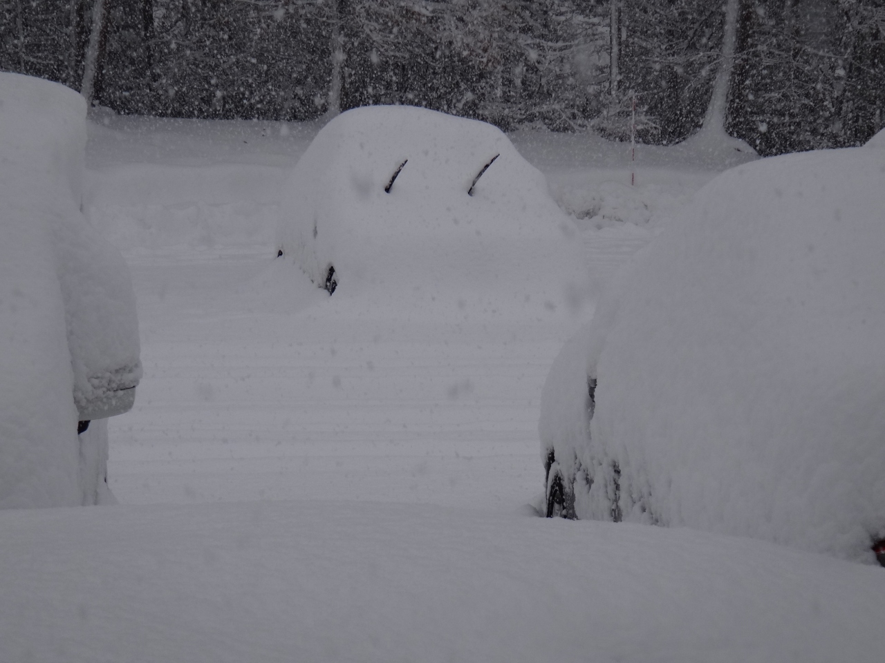 朝起きてみると車が雪だるま状態(一晩で50センチ超)。ホテル玄関にスコップ等が置いてあり、自分で除雪して出発。ホテルの方のお手伝いはなしでした。(傷等のトラブル回避か・・)