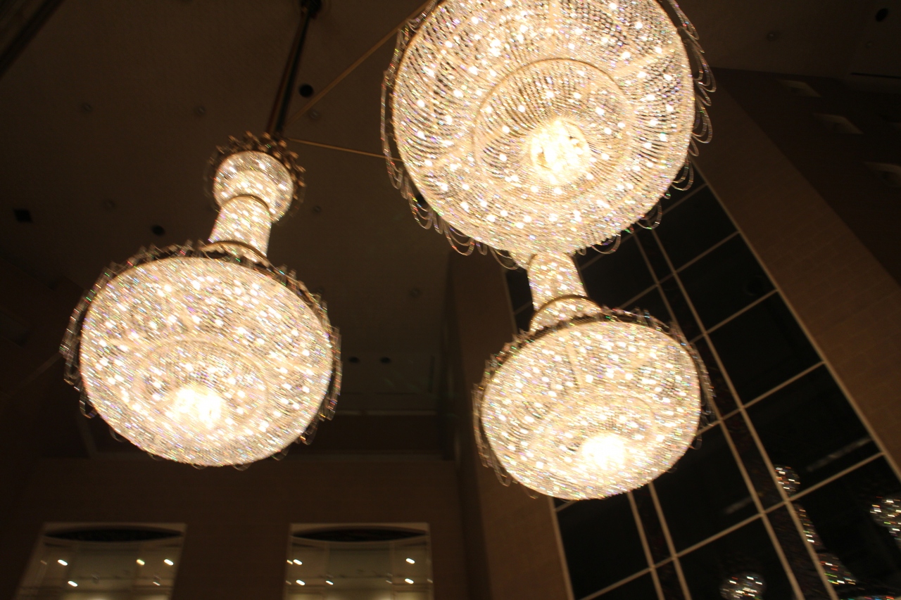 正面玄関を入るとロビー階の吹き抜けには巨大なシャンデリアが迎えてくれます。