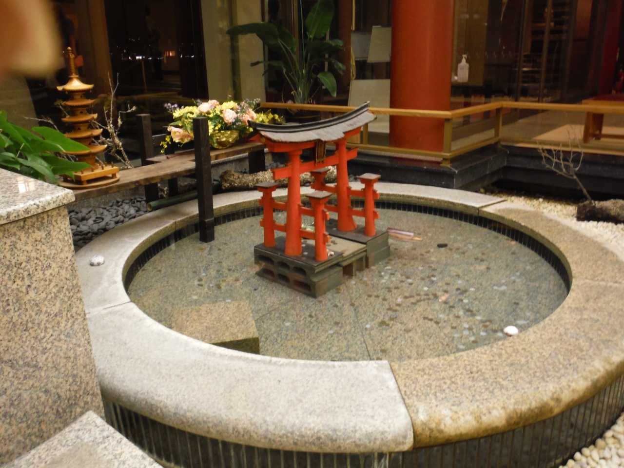 宮島のフェリー桟橋から厳島神社へと向かう、海沿いの道のちょうど中程にあります。ホテルを出たところから一本中に入る道があり、土産物屋が連なっています。但し、宮島の夜は早いので、お土産を買ったりするのは早めにした方がよいようです。大浴場もあり、洗い場の床が畳敷きになっています。