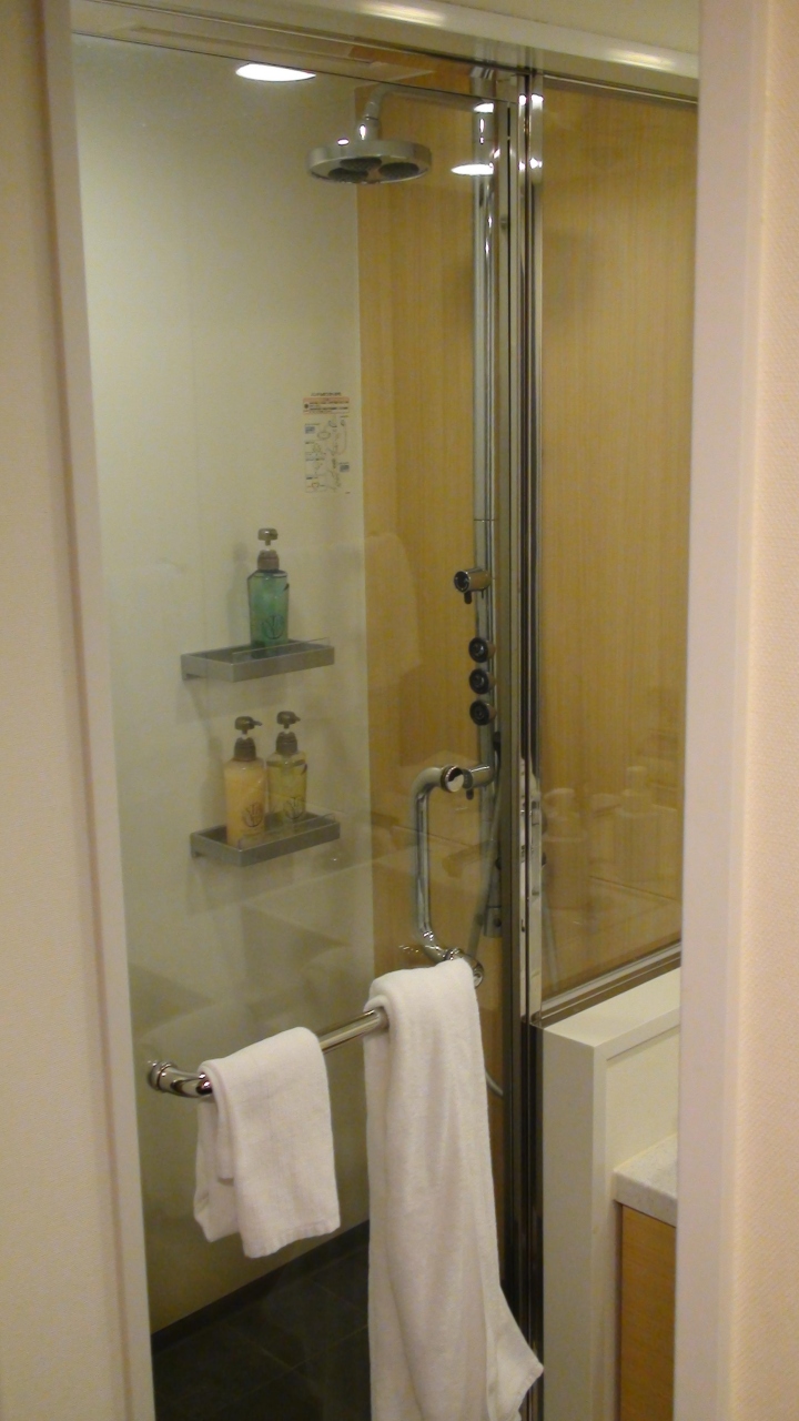 部屋のお風呂がガラス張りのシャワールームで、マッサージ水流になったり