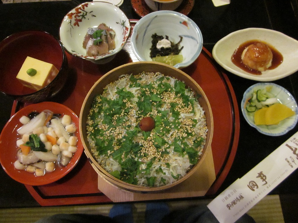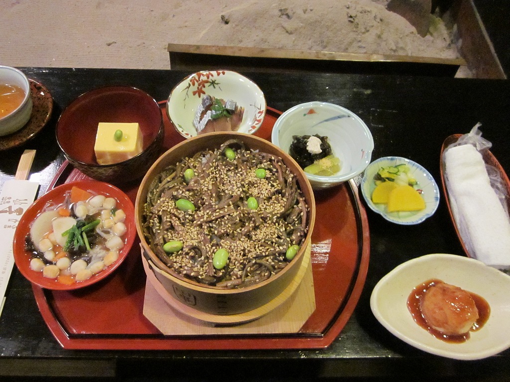 夜の食事は2,000円のコースからだそうで、この2,000円のコースに500円でこづゆを付けたものを頂きました。めっぱ飯もおいしかったですが、とうもろこしの豆腐が甘くてとてもおいしかったです。