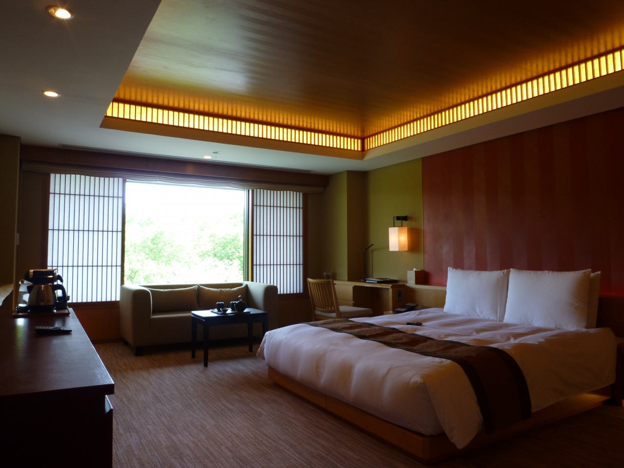 客室は広々とし、窓から望める空と木々がまるで1枚の絵のよう。