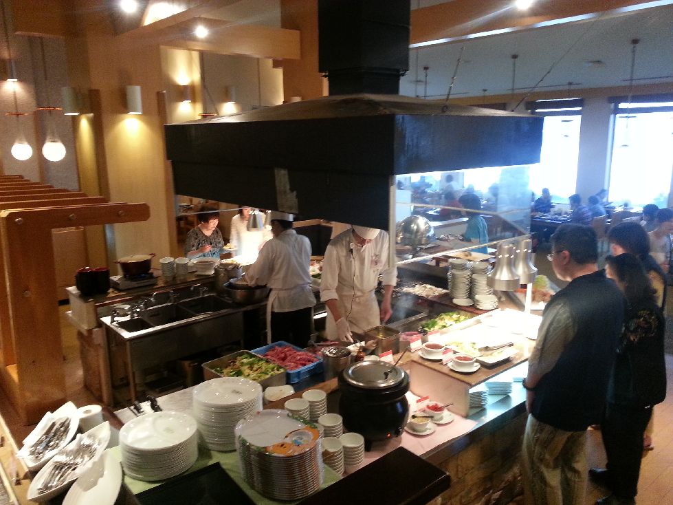 本当は、夕飯は個室でセットメニューを食べる予定でしたが、幼児同伴の場合は個室利用が不可のようです。他のホテルと同じようなバイキングかな?って半分あきらめて夕食会場へ。ところが各料理がとても美味しい。またステーキやてんぷらなどはその場で料理してくれるし、味も良かった。これならバイキングもありですね。部屋は低層ベットと布団で4名ゆったり宿泊。ベランダからのサロマ湖はとてもきれいでした。