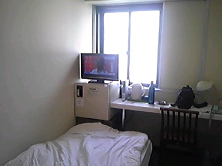 別館シングルは狭く窓を遮る用に冷蔵庫の上にテレビが