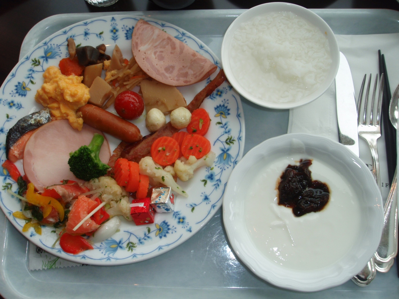 朝食は、?30階のレストランで洋食バイキング ?3階の和定食 ?ルームサービスの中から自由に選べることもできました。我々が利用したのは?です。豊富な食材が準備されて大満足でした。ただ案内された窓側の席を、食材を取りに行っている最中に外人に占領されてしまったので、そのことをスタッフに伝えました。予約席との表示を日本語や英語でテーブルの上に置いておくシステムがあればトラブルは起きなかったと思います。