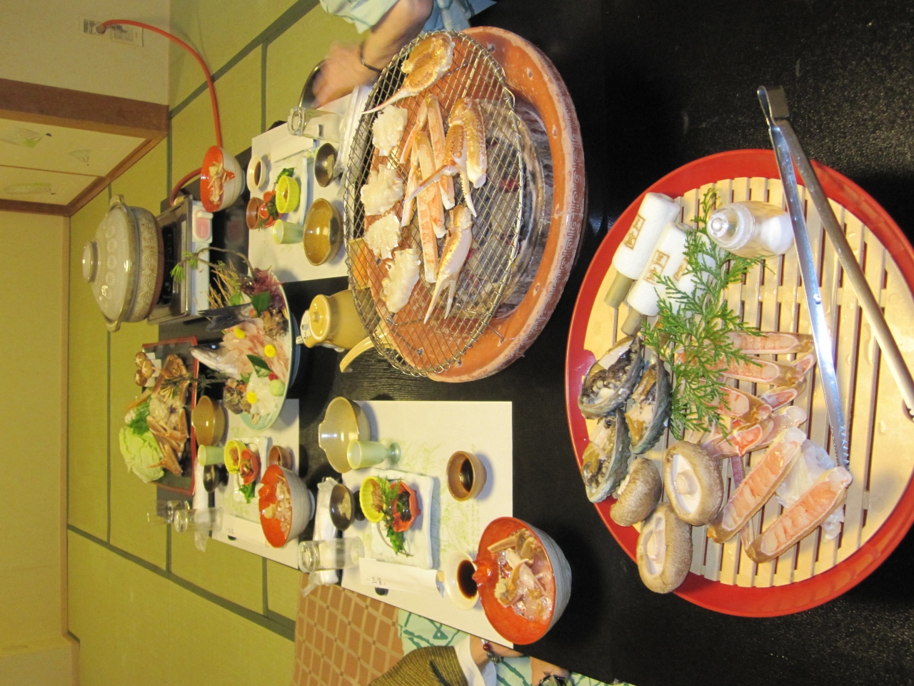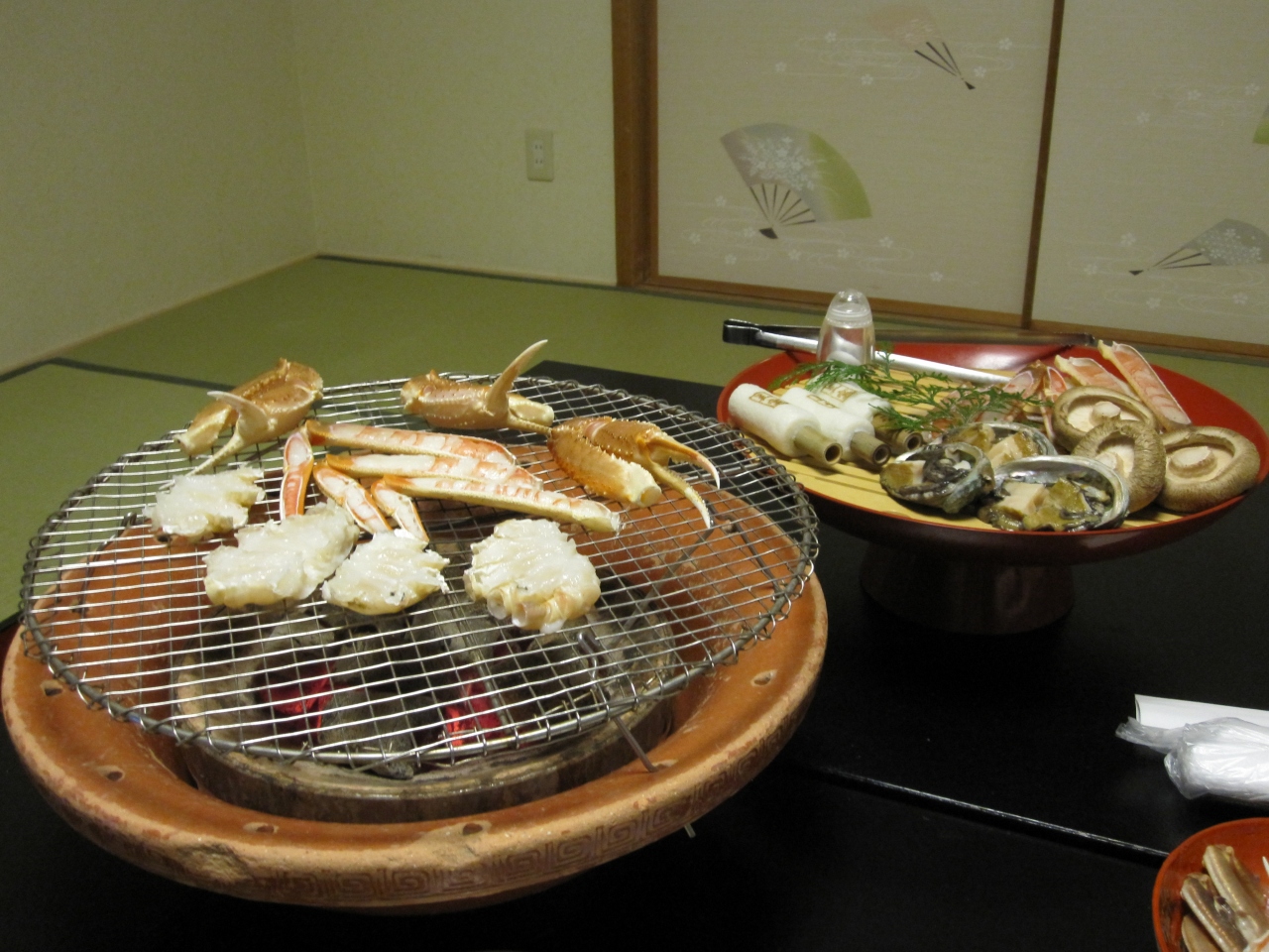 カニだけではなく但馬牛も頂けるコースにしました。お部屋食です。大きな火鉢ではカニだけではなく、しいたけや竹輪を焼いて頂きました。但馬牛のハーブ塩包み焼も美味しかったです。カニだけもいいのですが、ちょっと違ったメニューがあるのも良かったです。火鉢で焼いた竹輪はお宿のオリジナルでとても美味しかったです。朝市で販売しているとの事でしたが、私達が行った時には残念ながらありませんでした。