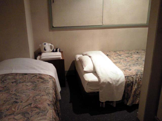 今回利用した部屋は本来シングル仕様のスペースにエキストラベッドを入れたような作りで、狭いと感じました。1人なら片方のベッドを荷物置きにすれば良いですが、2名での宿泊だと少し厳しいかもしれません。メインのベッドは110幅のワイドシングル、もう一方は90幅のスモールシングルでしょう。シーツ類の清潔さに問題はありません。室内では弱いながらもWiFiが使えました。