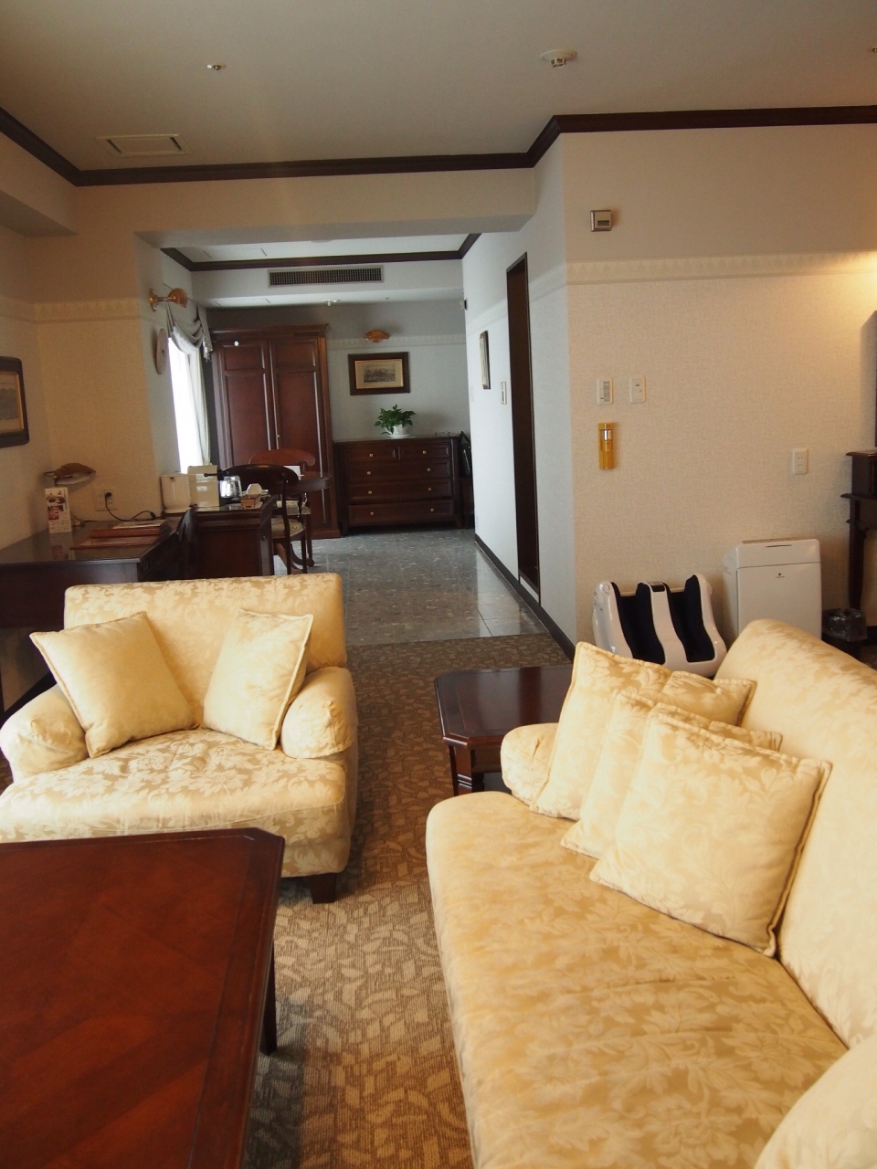 どんなスイートルームだろうと期待が強すぎたのか、床が途中までタイルで途中から絨毯、お風呂は家庭的な感じ、小さなベランダと、がっかり感が募りました。