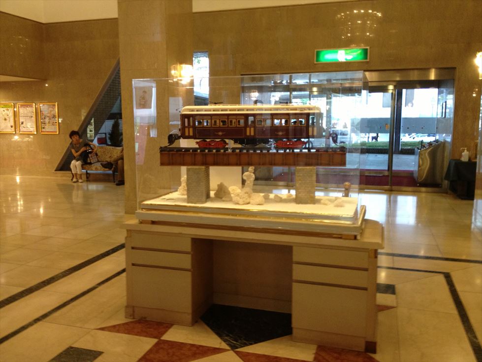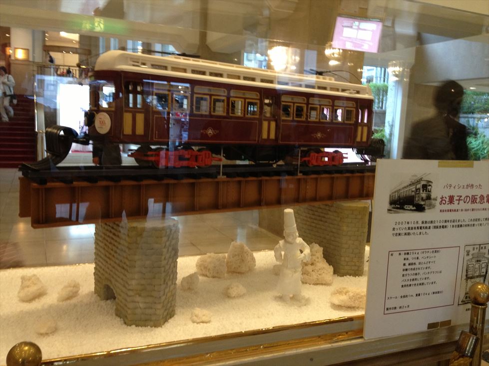 宝塚ホテルでは、様々なイベントを行っていますが、おすすめは、パティシェが作った、お菓子の阪急電車ですね。本物と思える色で、立ち止まって見る価値が有ります。細部にわたって拘りをもったお菓子です。ぜひ、一度、見に行ってみてください。