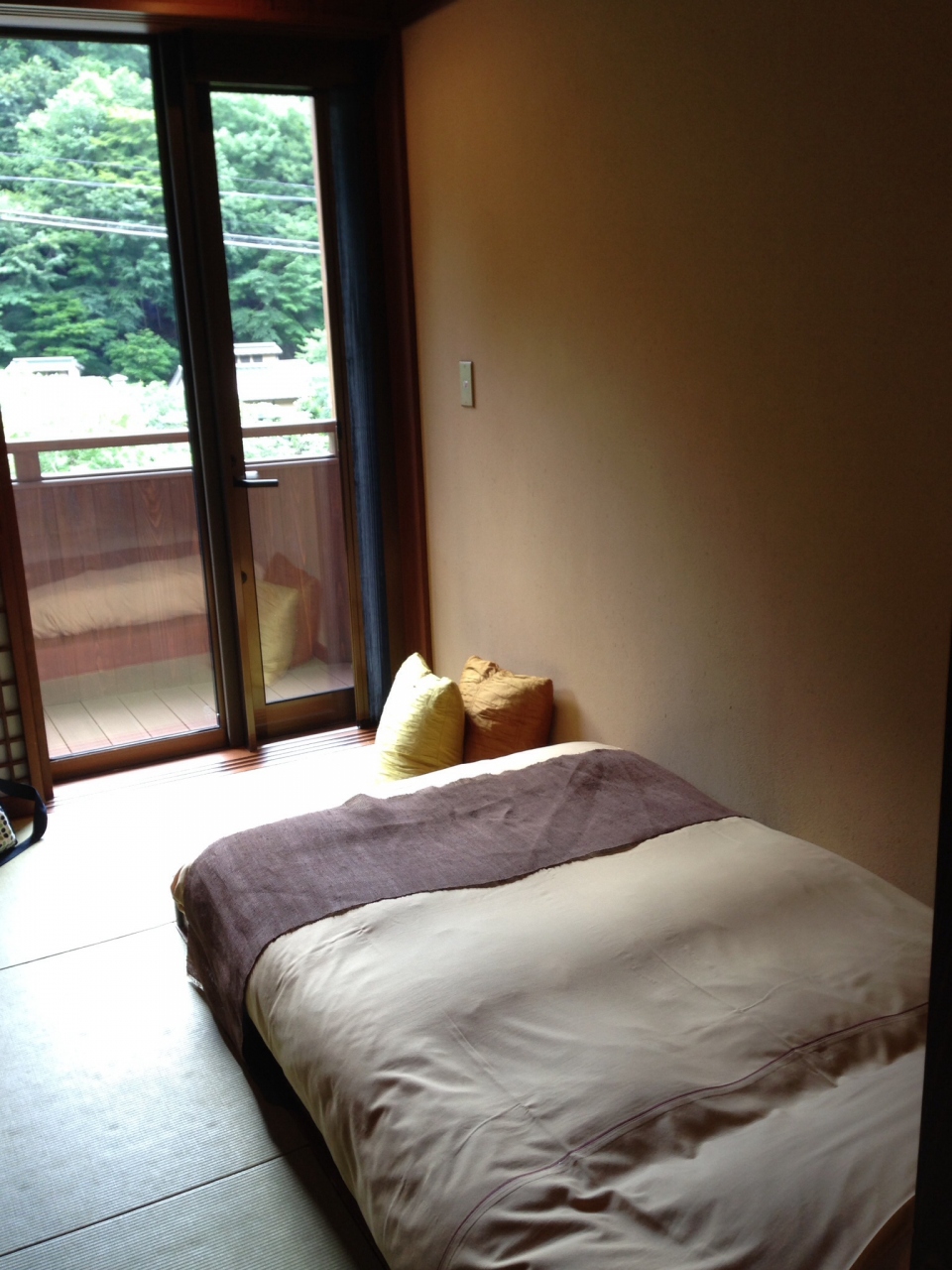 14:00チェックインにはほんの少し早かったと思いますが、快くチェックインさせていただきました。お部屋は1階のデッキテラスつきシングル「明(あかり)」の間です。広さはよくあるビジネスホテルのシングルと言った感じですが、畳にローベッド、黒電話、湯沸かしポットなど、和モダンを感じさせるセンスの良いお部屋です。デッキテラス用の下駄に汚れ防止の蓋がついているなど、細かい気配りが感じられます。うちのベランダにもこの蓋が欲しいと思いました。窓を開けると四万川の川の音が響きます。これで川が見えたら最高だったのですが、川は見えず。音のみ。