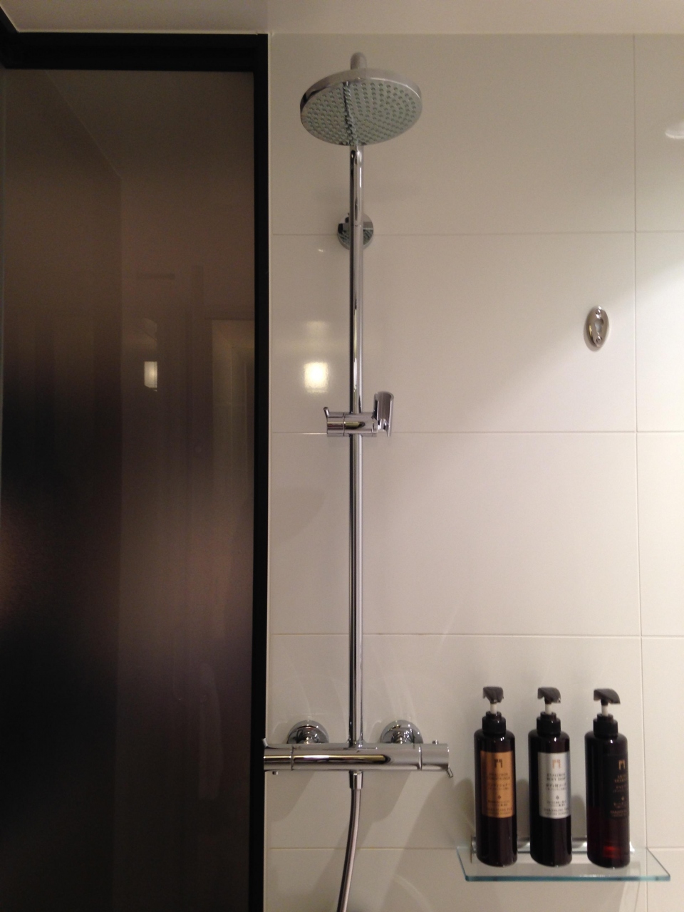 部屋は清潔感があり、シックな壁の色がステキです。こちらはお風呂が凝っています。バスタブと別に洗い場があり、シャワーはハンスグローエ社製レインダンスシャワー。アメニティは日本のナチュラルコスメブランド「ゼミド(GemiD)」。浴室の一部がすりガラスになっていて、客室側からもうっすらと透けて見えます。これがちょっとドキドキ。