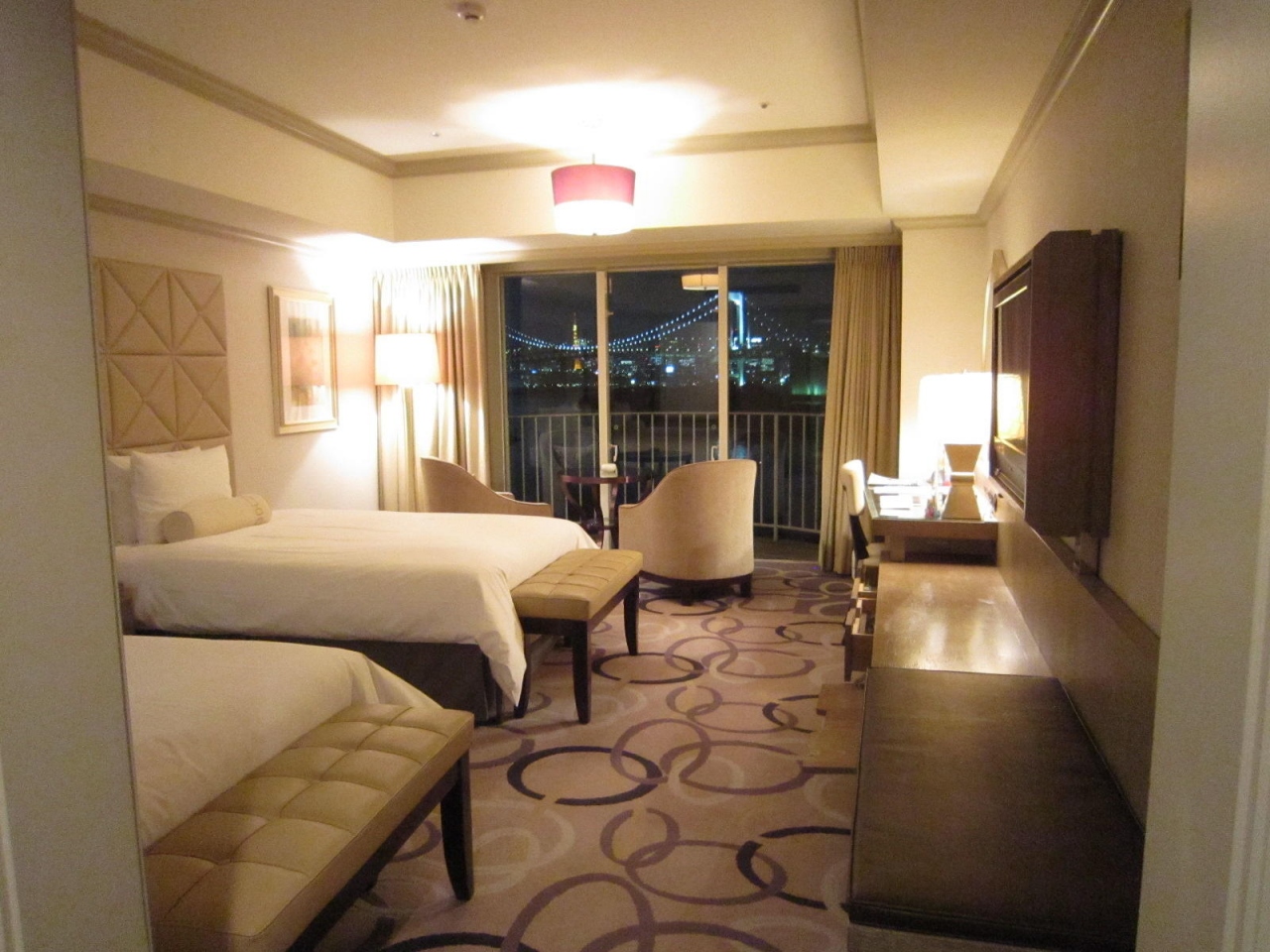 ベッドがシモンズで非常に心地よかった。お風呂から夜景が見えてすごく幻想的でした。東京のレインボーブリッジが真正面に見える部屋でテラスにも出られたので景色を楽しむために用意されたホテルだと思う。