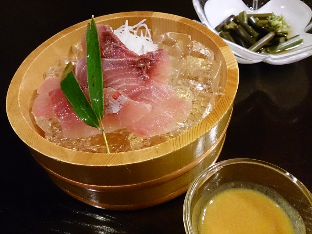 夕食の料理のひとつ、「こいの洗いの清流仕立て」。
