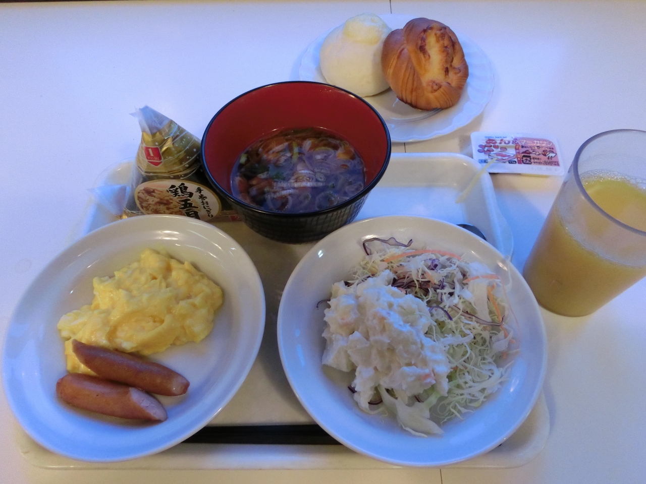 もちろん、ホテルレストランのバイキング朝食などとは比べられませんが、おにぎりやパンが選べ、サラダに味噌汁もあります。