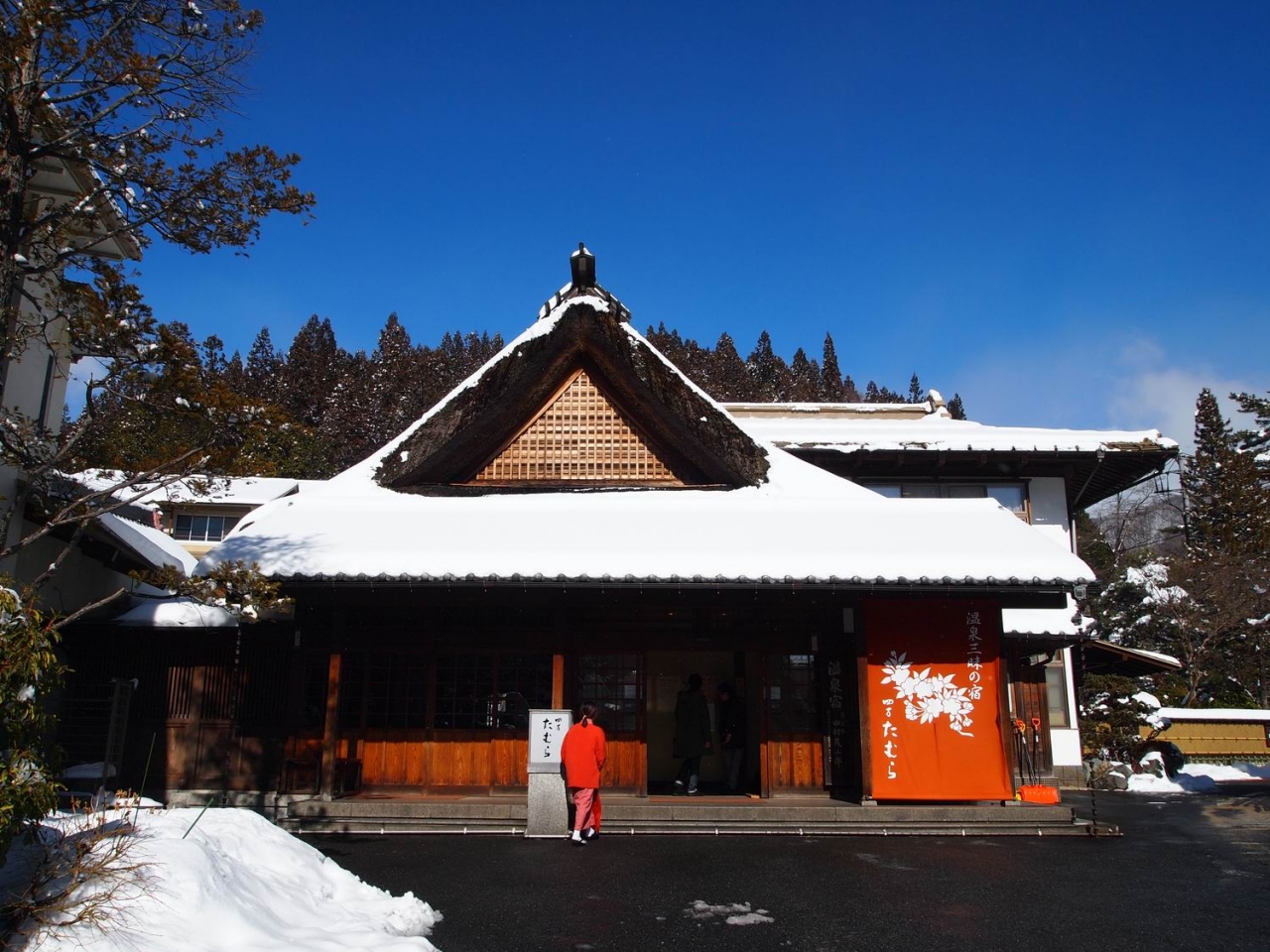 四万温泉バス停から急な坂道を登ります。大雪の日でしたが温泉水が流れているので凍って滑ることはありません。和風の素敵な建物でいかにも旅館という感じです。お風呂はいくつかあるので、何回入っても楽しいです。2階がベットルームになっている広い部屋だったのですが、やはり布団で寝ました。2万円ちょっとでお得なプランだったと思います。