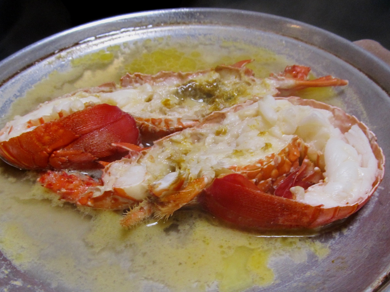 伊勢海老のワイン煮(3,800円)を追加注文。ビール2本、日本酒3合、焼酎2盃=2人で2万8千9百円。