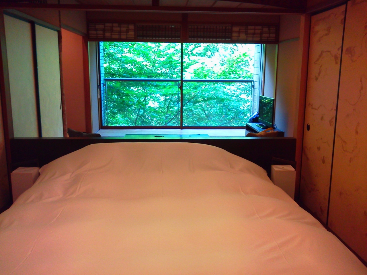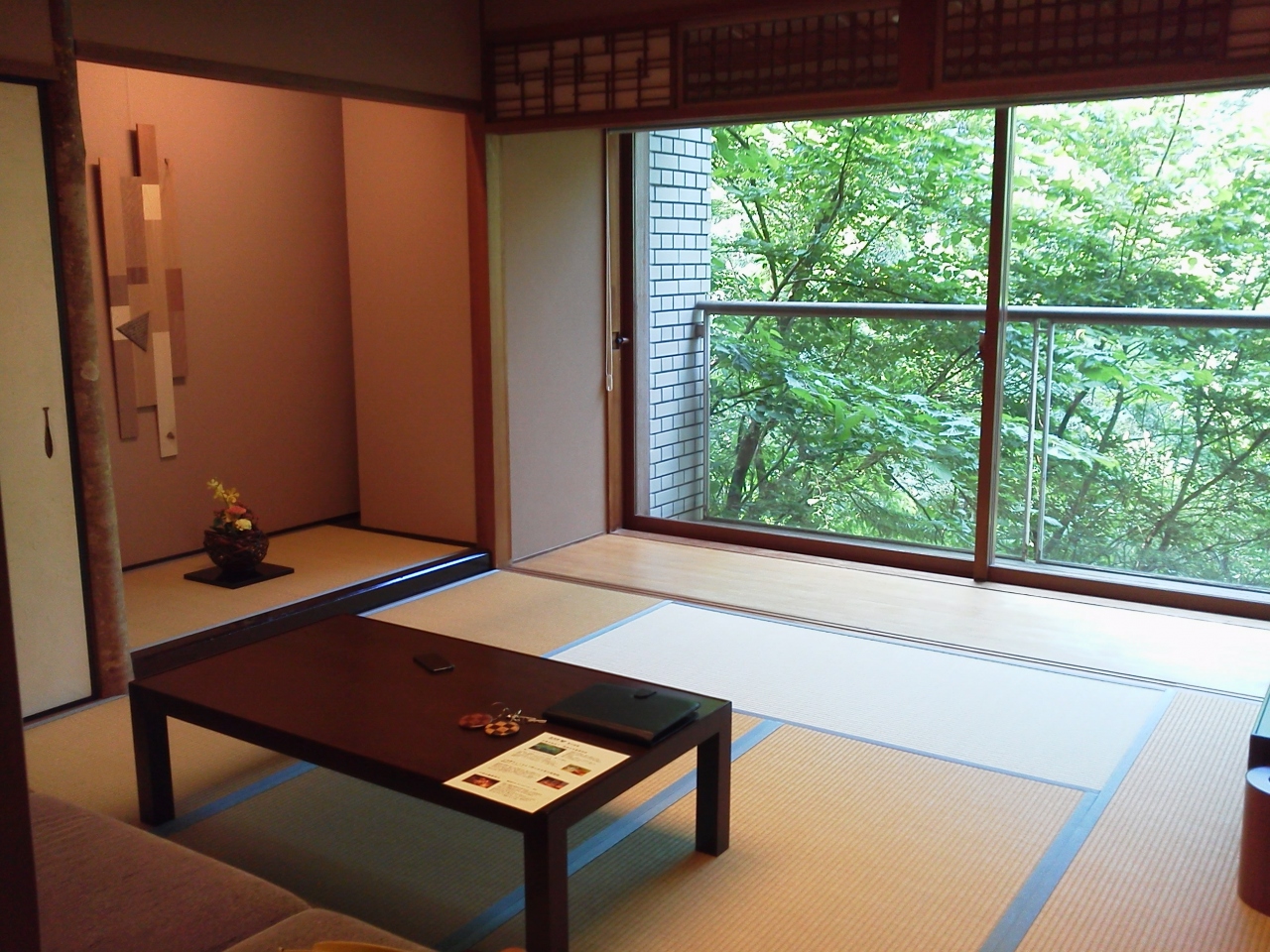 お部屋は、和風でモダンな感じの造り。窓からの眺めが美しい緑の木々でいっぱいだったので癒やされました。