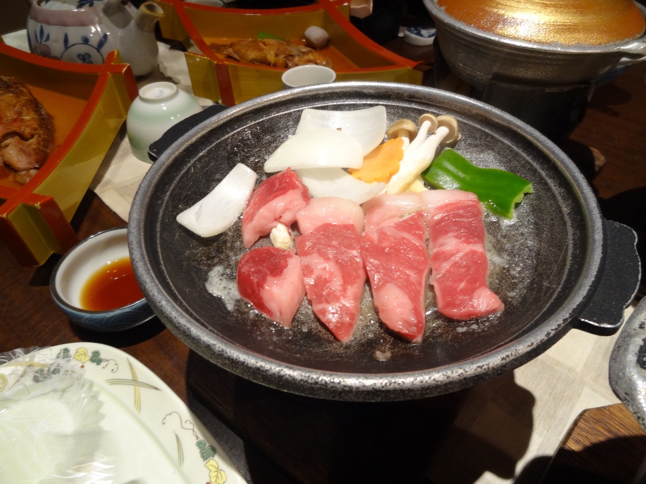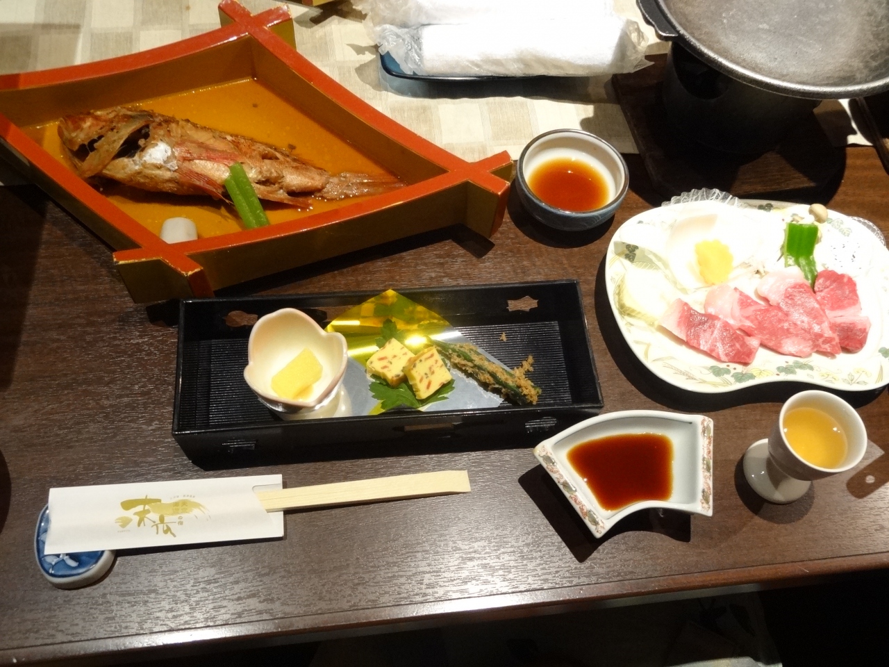 料理は私たちのプランは宿おまかせでしたが、牛ステーキ、地元産豚肉の鍋、八丁味噌で炊いた地元産鶏肉、一人につき一匹の伊勢海老の造り、地元でとれるメヒカリの唐揚げなど、味も量も満足でした。