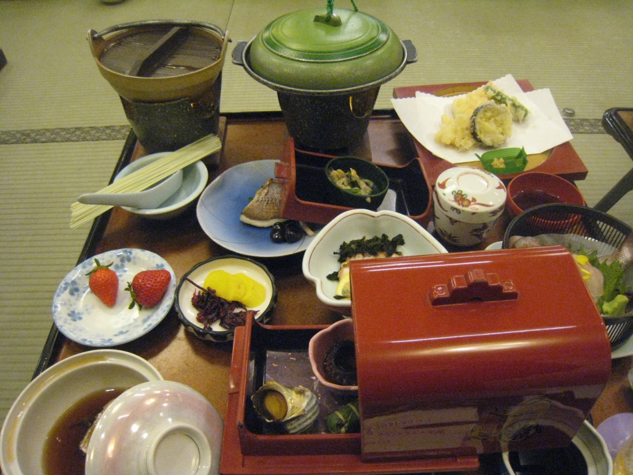 食事は食べきれないほどどっさり。最後に鯛めしが出て満腹になりました。宿の方のサービス精神は旺盛です。小豆島名物のオリーブサイダーというのが何種類かあるのですが、味の違いを一生懸命説明してくださいました。団体へのサービスだったのか、季節はずれのお餅つきもありました。餅は別腹ということで、こちらも残さずお腹の中に。いや~よく食べました。