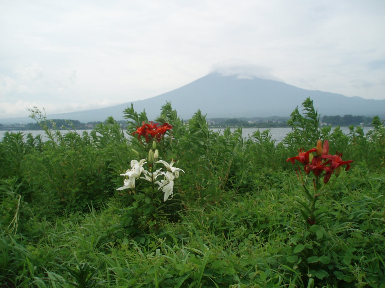 川口湖畔で、天気が良ければ富士山が正面に見えます。