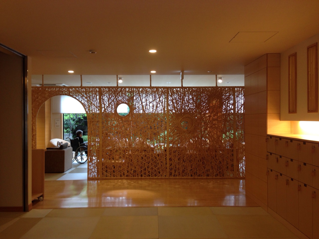 エントランスを入ると竹で編んだパーテーションで囲まれたくつろぎのソファースペースが広がります。綺麗に整えられたお庭が望めます。