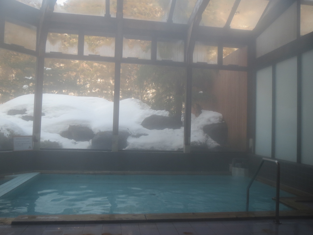 「こもれび乃湯」の内湯は天井が高くガラス張りで温室の様に日差しが入ります。浴槽サイズは6、7畳といった感じ。お湯は滔々と掛け流されています。眺めの良い露天は4、5畳ほどの四角い木の浴槽。湯縁が見えないいわゆるインフィニティエッジ。