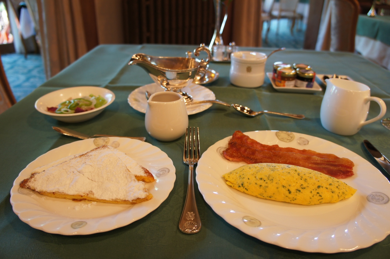 朝ご飯はクラシックなレストランでフレンチトーストを頂きました。ブッフェなどでは感じられない優雅な雰囲気にひたれます。