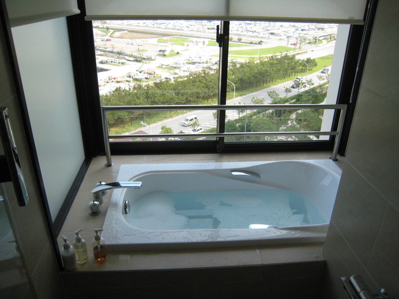 シービューのバスルームは部屋によっては、表から丸見えですが、高層階でしたので、夜に電気を着けずに月明かりに照らされたハーバーを眺めながら入りました。