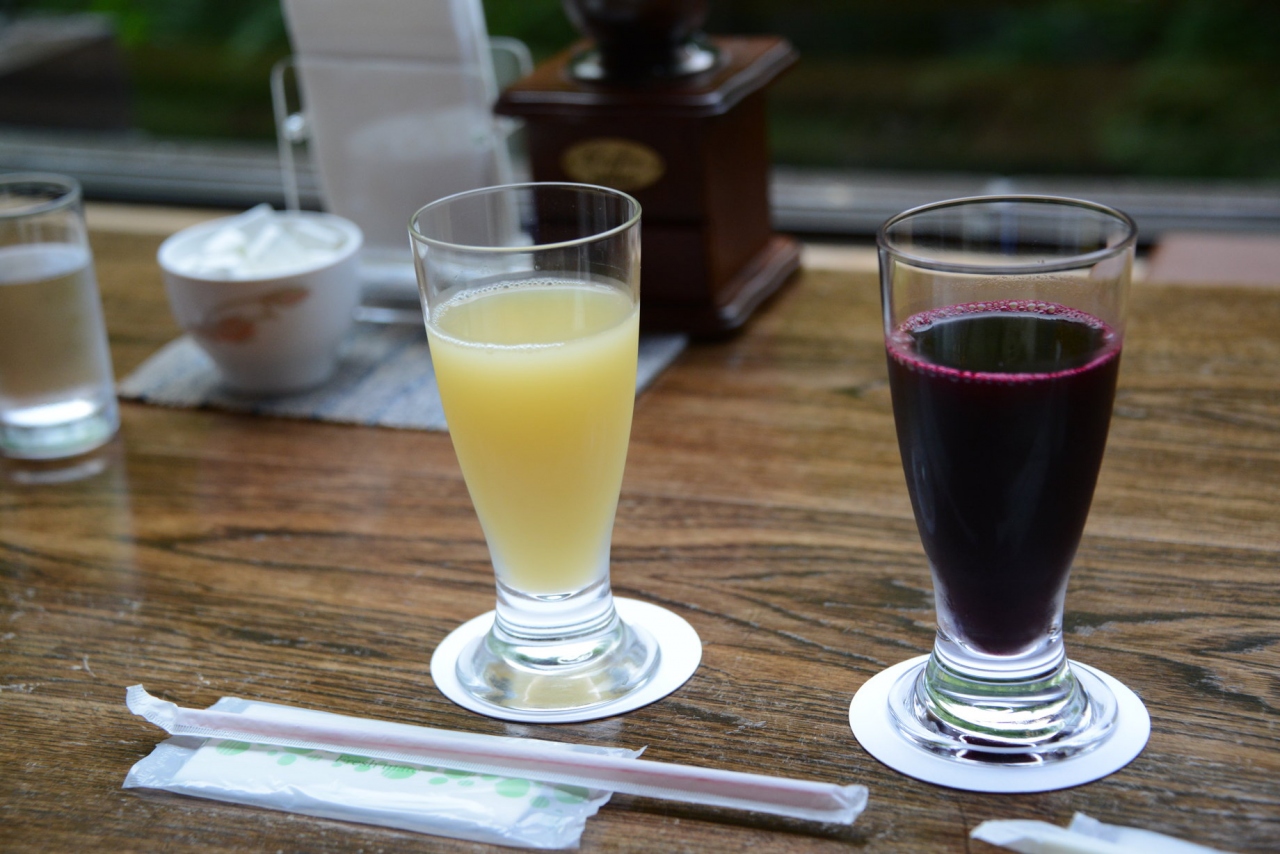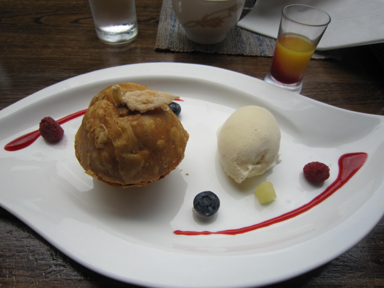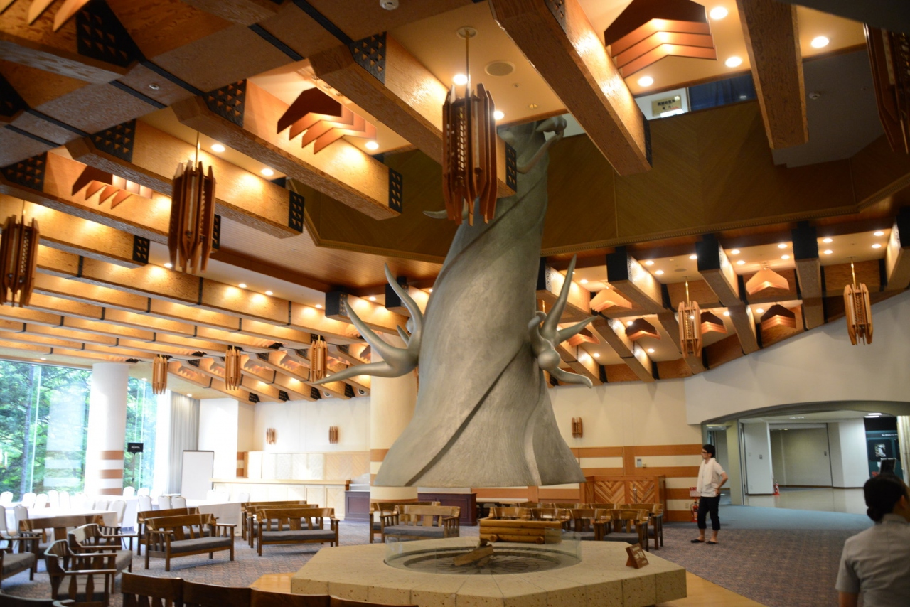 岡本太郎の作品は、ホテルのロビーに重厚な雰囲気を与えていますね。「森のカフェ」は、ガラス越しに見える木立や渓流も素敵でした。リンゴのスィーツはおいしかったです。お値段は少し高めのホテルカフェ価格ですね。